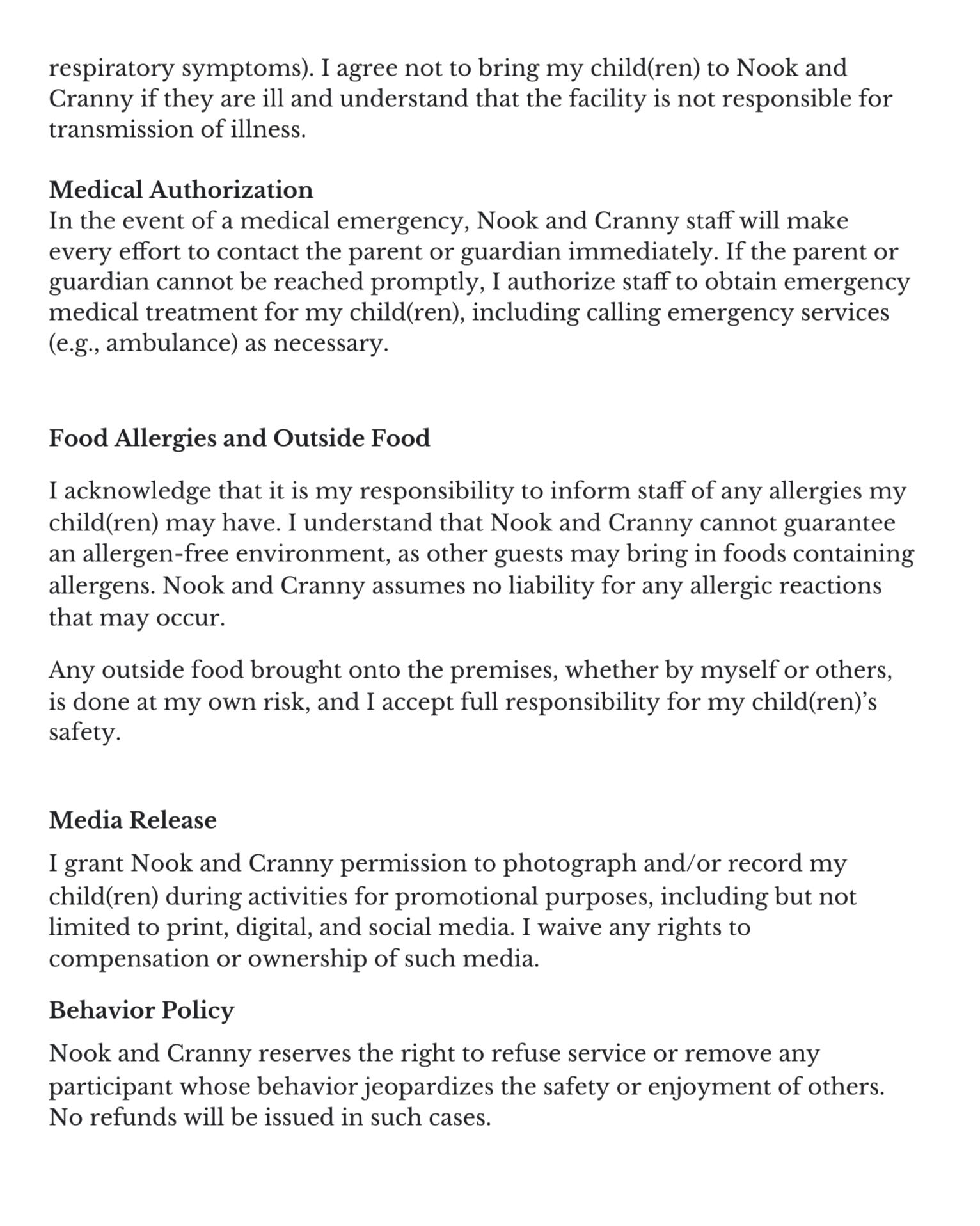 Additional children (up to a total of 20 children) are $10 each. Adults are welcome and are not counted in the child total.Although outside food and drinks are welcomed, Nook and Cranny does not provide any access to a fridge, oven, utensils or kitchen.The final headcount is due 2 days before your event. Additional children may be paid for on the day of the party upon arrival. Early weekend slots may be available with at least 3 months' notice, but not guaranteed. Please give us a call to request a different time slot or to discuss any additional accommodations—we’re happy to help!